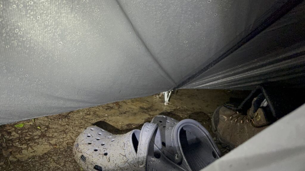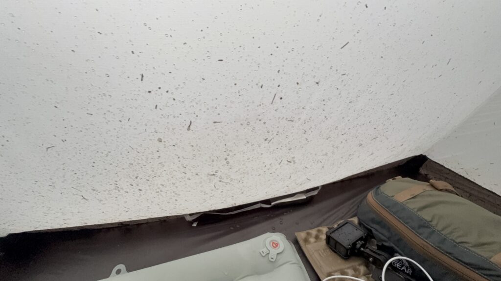 特に前室部分は跳ね返りがひどく、置いていた靴がしっとりと濡れるほど。ただ雨を凌ぐだけでなく、「地面からの跳ね返り」をどう防ぐかが、このテントを荒天で使う際の最大の課題だと感じました。