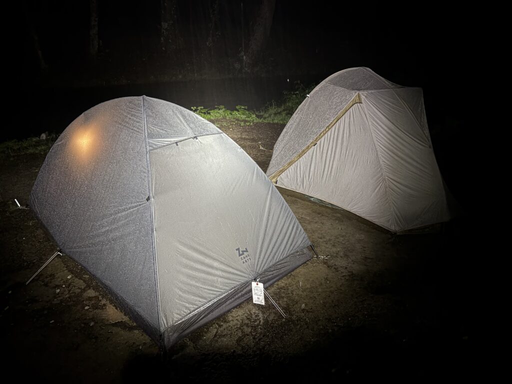 小梨平キャンプ場に到着した初日の夜から、雨脚が強まりました。時には地面を叩きつけるような土砂降りとなりましたが、まずは「浸水」という面での検証結果をお伝えします。