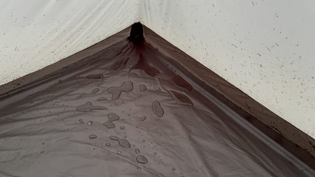 今回の土砂降りで最も想定外だったのが、**フライシートを伝って落ちた雨の「跳ね返り」**です。ヤール2は軽量化を優先した設計のためか、地面とフライの隙間から入り込む雨の跳ね返りが激しく、それが直接インナーテントの高い部分まで濡れてしまいました。